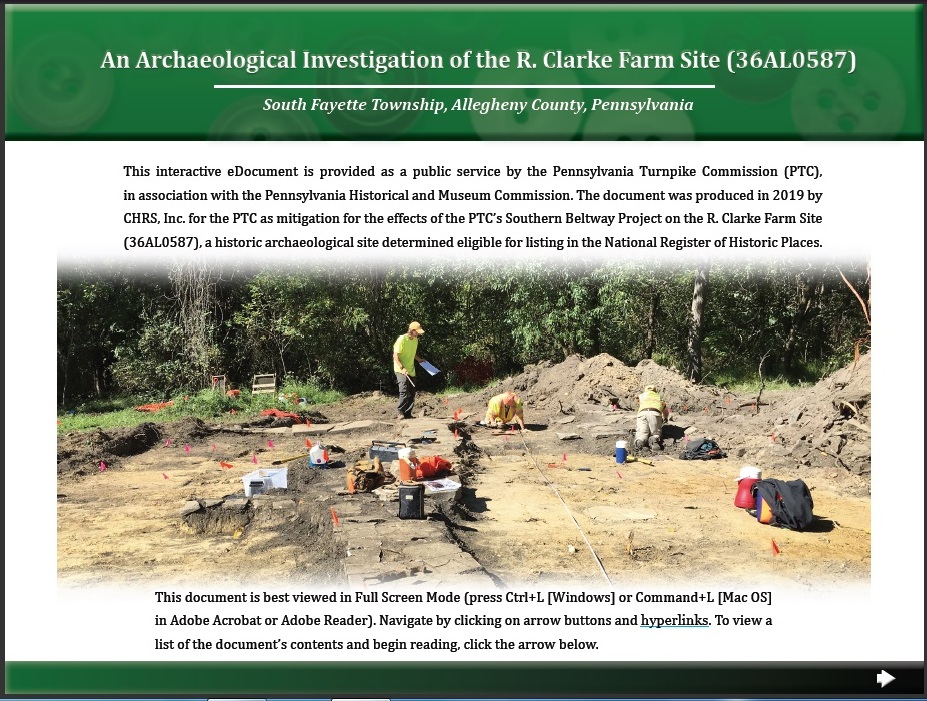 An interactive eDocument provided as mitigation for the effects of the Pennsylvania Turnpike Commission’s Southern Beltway Project on the R. Clarke Farm Archaeological Site (36AL0587, a nineteenth- and twentieth-century farm in Allegheny County determined eligible for listing in the National Register of Historic Places investigated in the course of archaeological surveys conducted for the Southern Beltway Project.